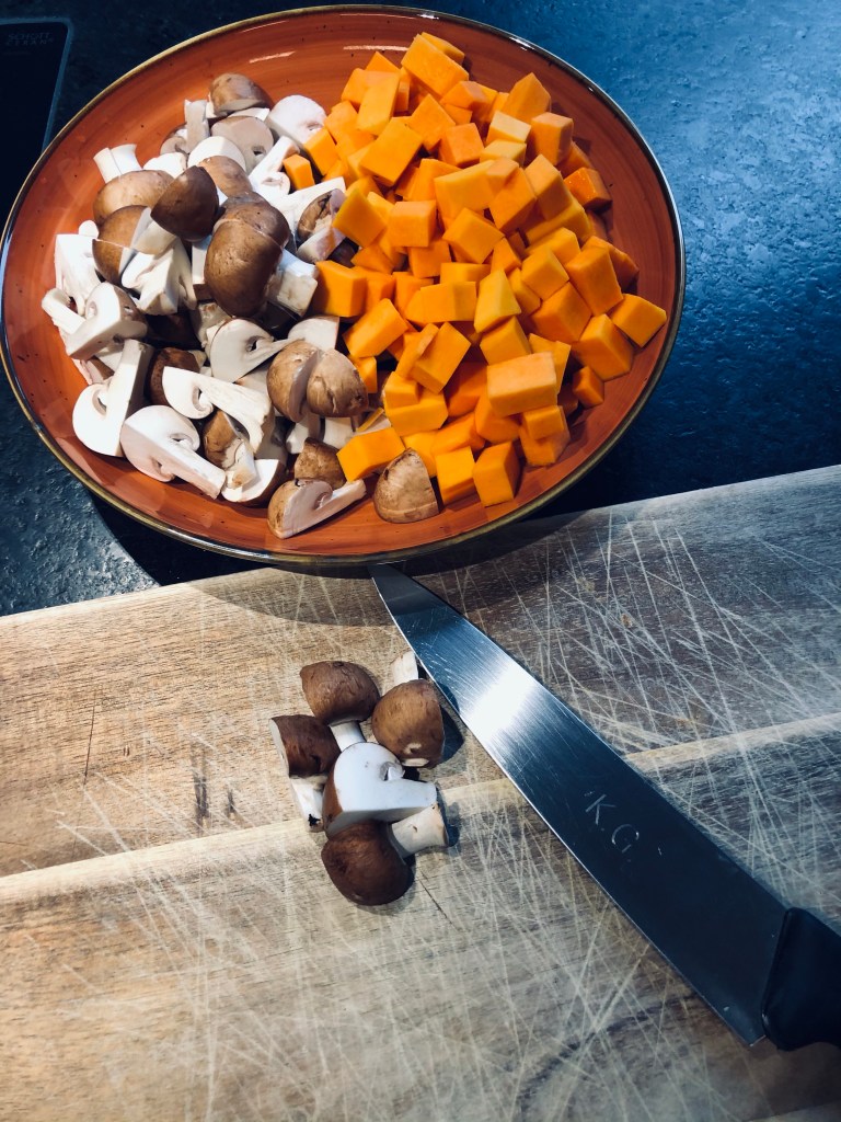 Mein Rezept heute ist für 4 Personen , obwohl ( Ja ich gebe zu, im Omnia hab ich es noch nicht getestet ) im Omnia wohl nicht die ganze Menge Platz haben wird. Bitte gebt mir hierzu ein Feedback sobald ihr das ausprobiert habt. Du brauchst als erstes den Butternut Kürbis , sauber waschen und rüsten , danach entfernst du die Kernen ( Die sind essbar , roh oder kurz angebraten mit etwas Salz eine Leckerei ) und schneidest den Kürbis in kleine Würfel , etwa ½ cm Grösse. Die braunen Champignons auch gut waschen und danach in Viertelstücke schneiden, ebenfalls kannst du noch eine kleine Zwiebel hacken . Würze noch das Fleisch mit Salz und Pfeffer und stelle es in einer Schüssel bereit.
